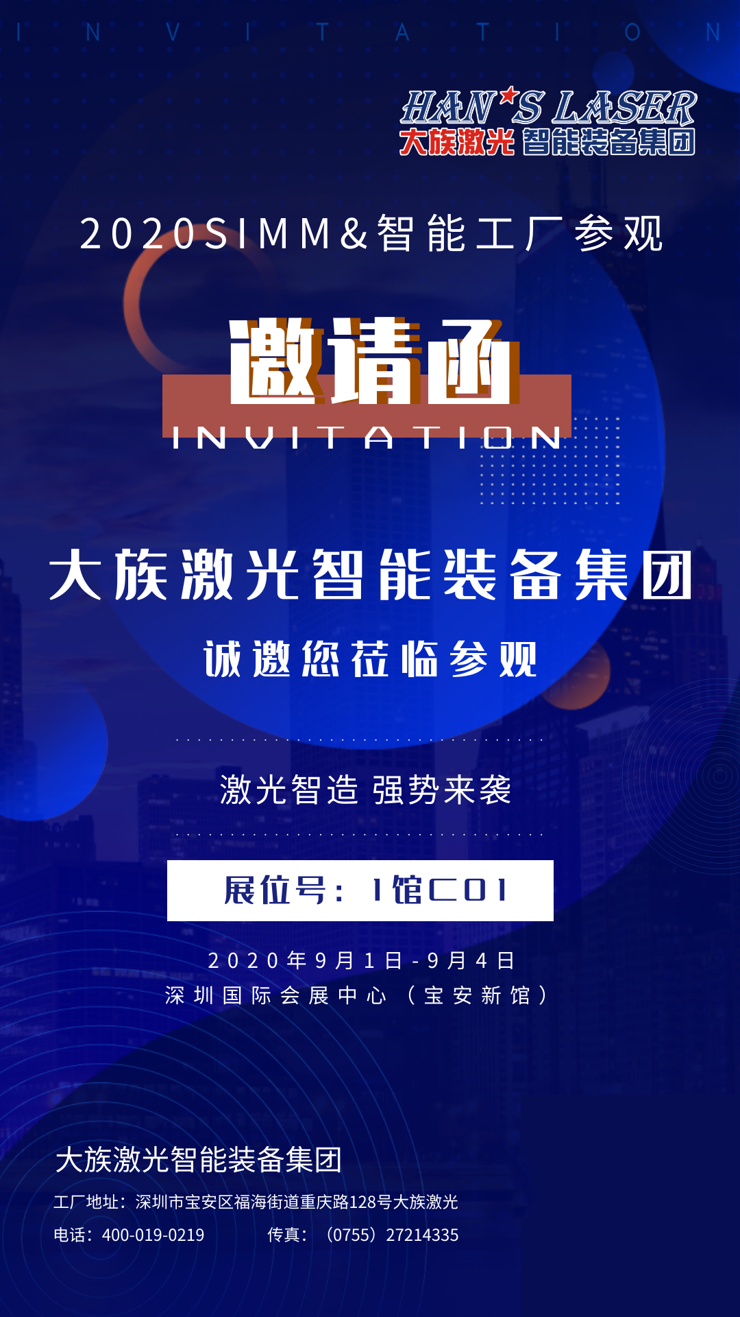 金秋九月,秋風颯爽。ITES深圳國際工業制造技術展覽會(第21屆SIMM深圳國際機械制造工業展覽會),將于2020年9月1-4日在深圳國際會展中心(寶安新館)舉行,大族激光智能裝備集團攜激光智能制造系統解決方案亮相,展位號1館C01;同期,舉辦大族激光智能工廠開放活動,期待您的蒞臨參觀!...